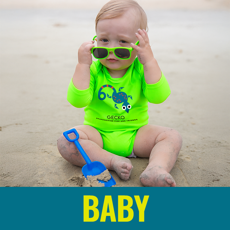 Stress-free, chemical-free, UV protection built into the fabric and never washes out. Sizes baby 3M - adult 3X.
